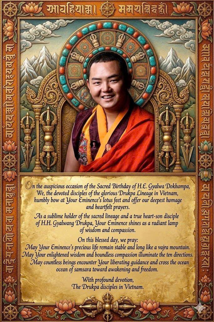 On this most auspicious and sacred occasion of the Holy Birthday of His Eminence Gyalwa Dokhampa, we - the devoted disciples of the glorious Drukpa Lineage in Vietnam - humbly bow at Your Eminence’s lotus feet and offer our most profound homage and heartfelt felicitations.