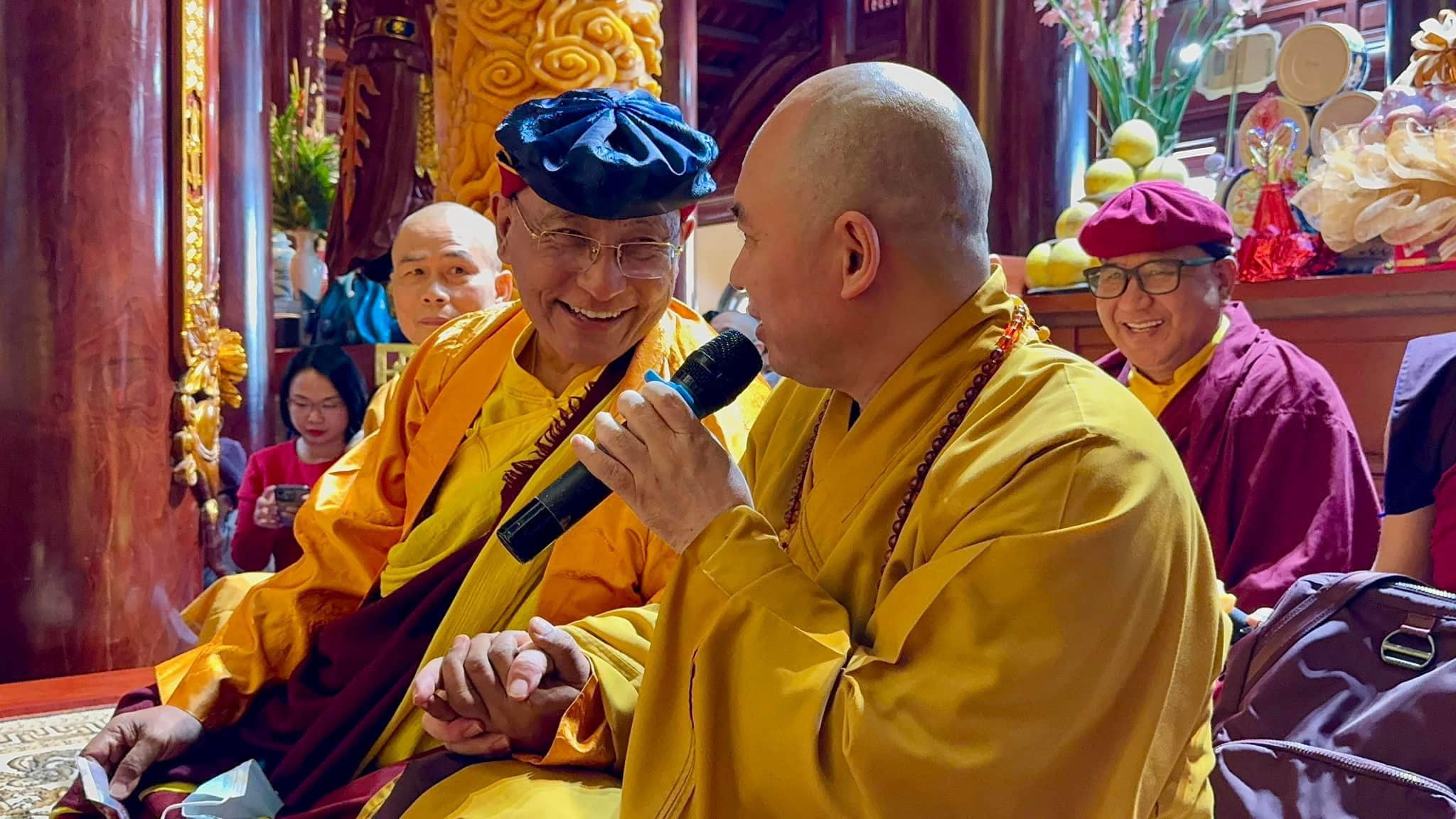 Chiều 2/2 (mùng 5 Tết Ất Tỵ), Đức Gyalwang Drukpa cùng thượng tọa Thích Đức Thiện trao đổi về ứng dụng khoa học, chuyển đổi số trong các hoạt động phật sự.