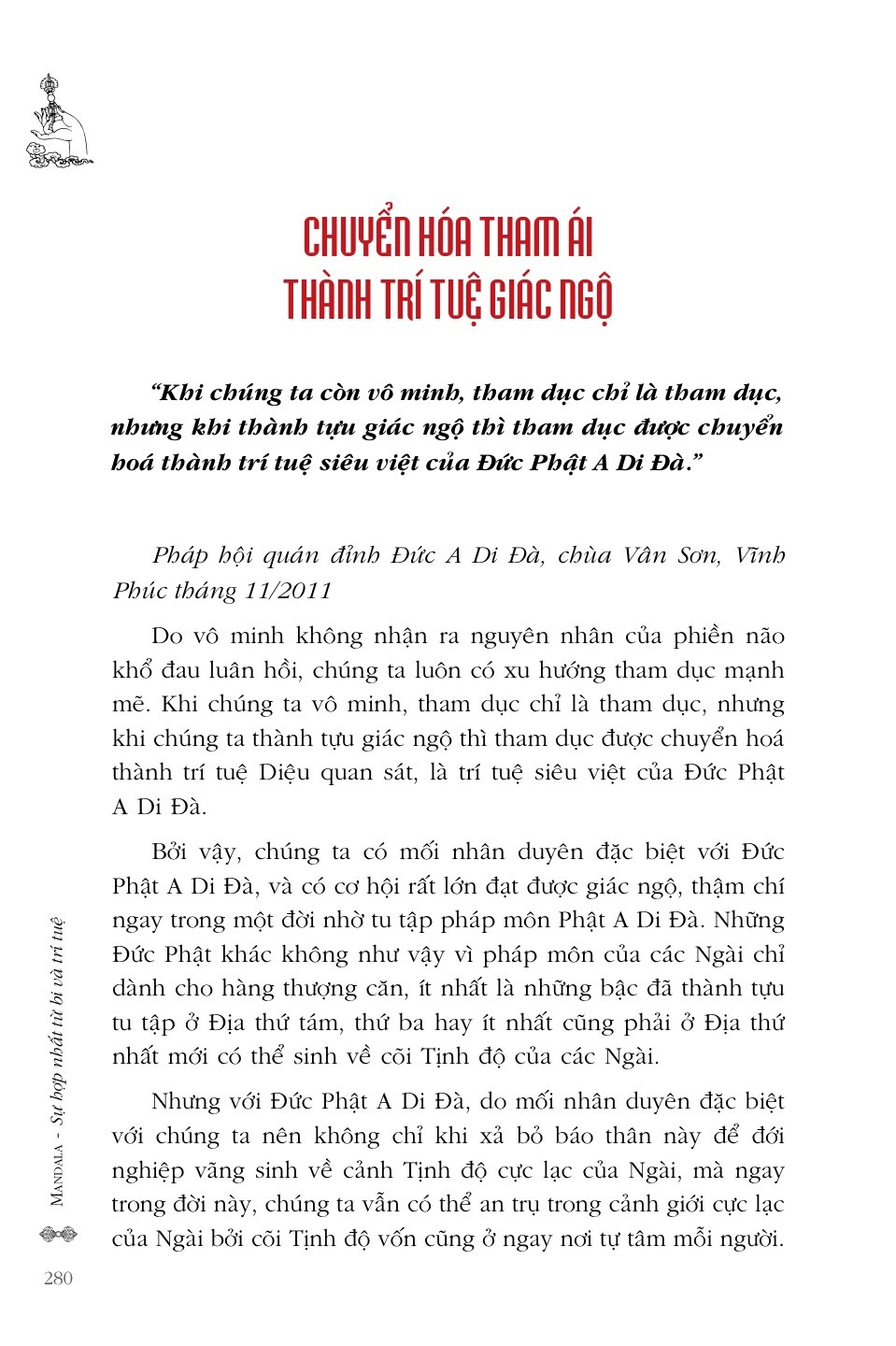 "Khi chúng ta còn vô minh, tham dục chỉ là tham dục, nhưng khi thành tựu giác ngộ thì tham dục được chuyển hóa thành trí tuệ siêu việt của Đức Phật A Di Đà". Đức Pháp Vương Gyalwang Drukpa chia sẻ giáo Pháp tại pháp hội quán đỉnh Đức A Di Đà, chùa Vân Sơn, Vĩnh Phúc tháng 11/2011 (trích dẫn từ ấn phẩm Mandala - sự hợp nhất Từ bi và trí tuệ theo quan kiến Kim cương thừa), do Drukpa Việt Nam biên tập và phát hành .