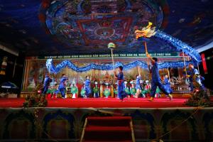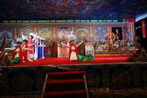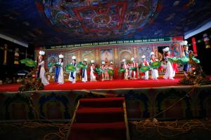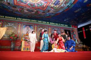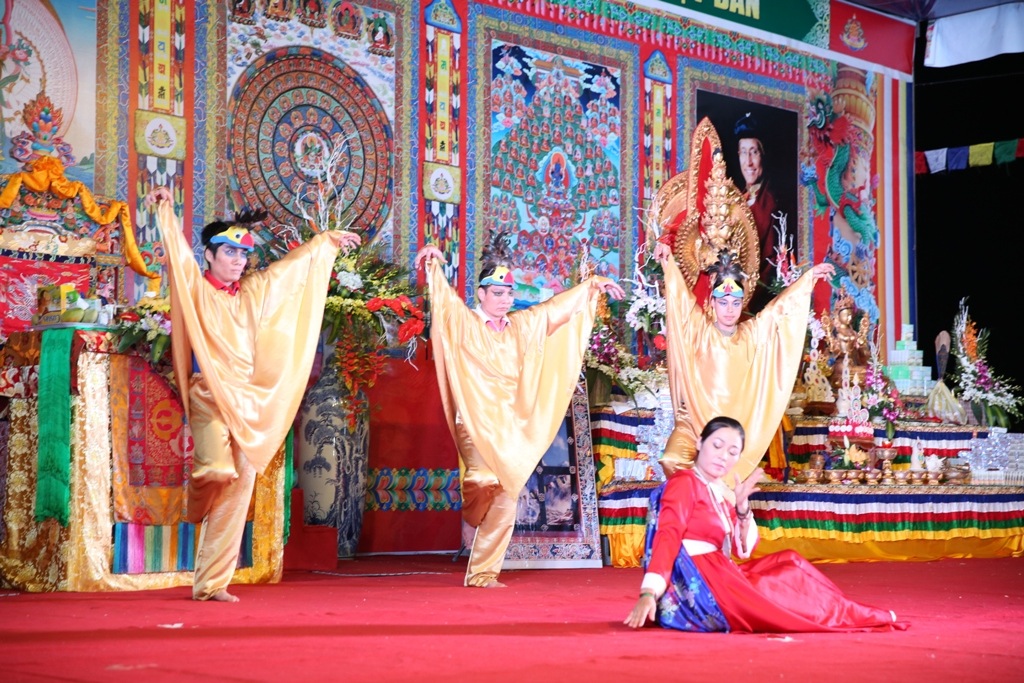Hình ảnh màn múa Vũ điệu Thăng Long và Bạch Liên hoa cùng tiết mục kịch lịch sử đản sinh của bậc Hóa thân Bồ Tát do các chư Ni Tây Thiên cùng các Phật tử Druka biểu diễn cúng dàng Đức Nhiếp Chính Vương Drukpa Thuksey Rinpoche cùng Tăng đoàn và đại chúng tham dự Pháp hội, ngày 30/04/2014.