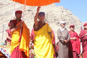 Cuối giờ sáng ngày 19/09/2016, sau khi Đức Pháp Vương và Tăng đoàn cử hành khóa lễ chính thức khai mở bức Thangka Đức Phật A Di Đà lớn nhất vùng Himalaya, chư Tăng Ni và du khách khắp nơi xếp hàng để chiêm bái Pháp bảo này với lòng chí thành tha thiết.