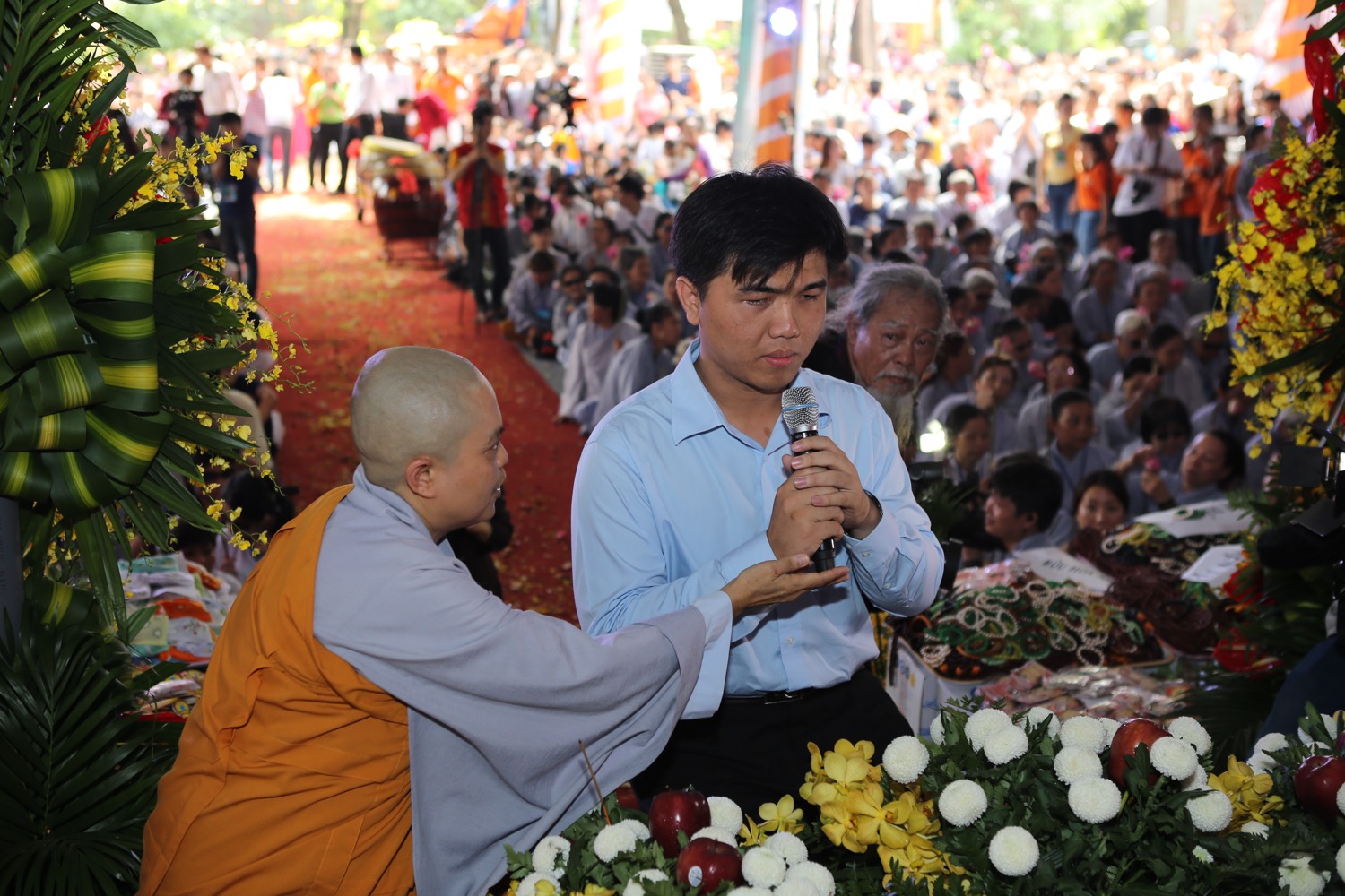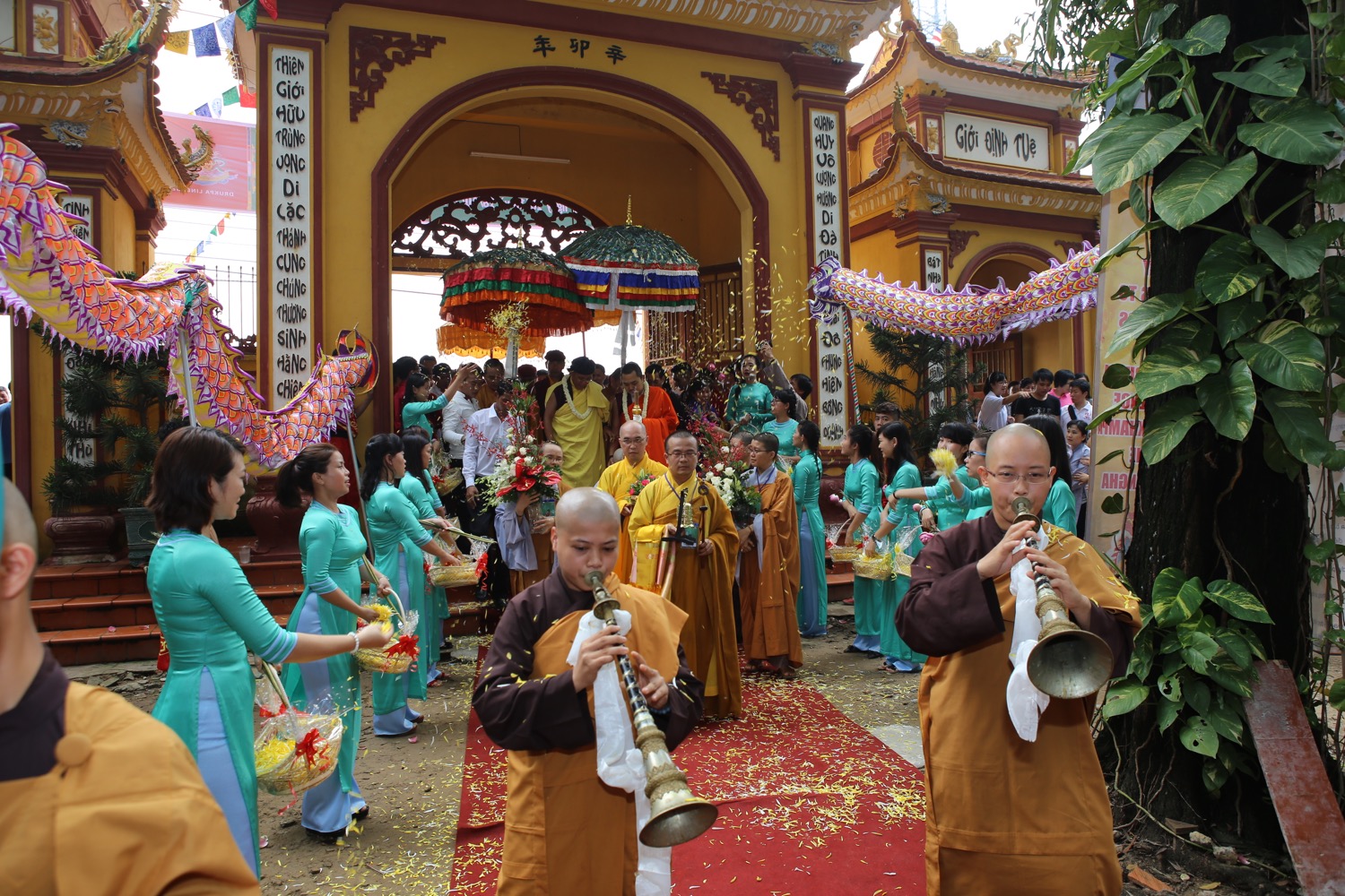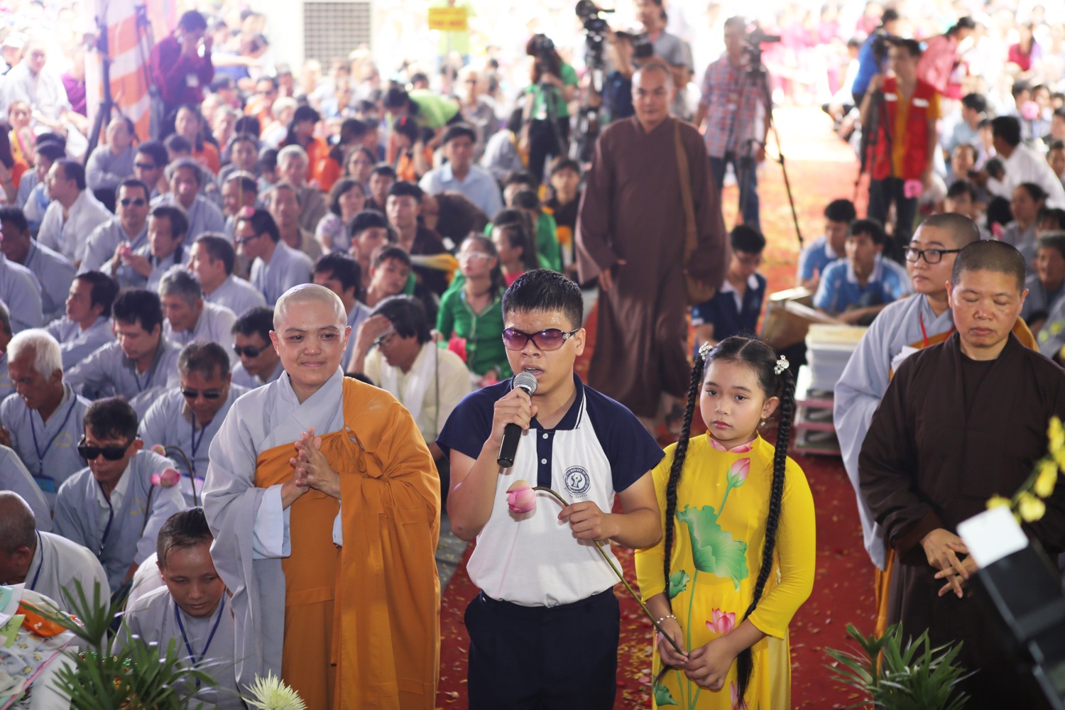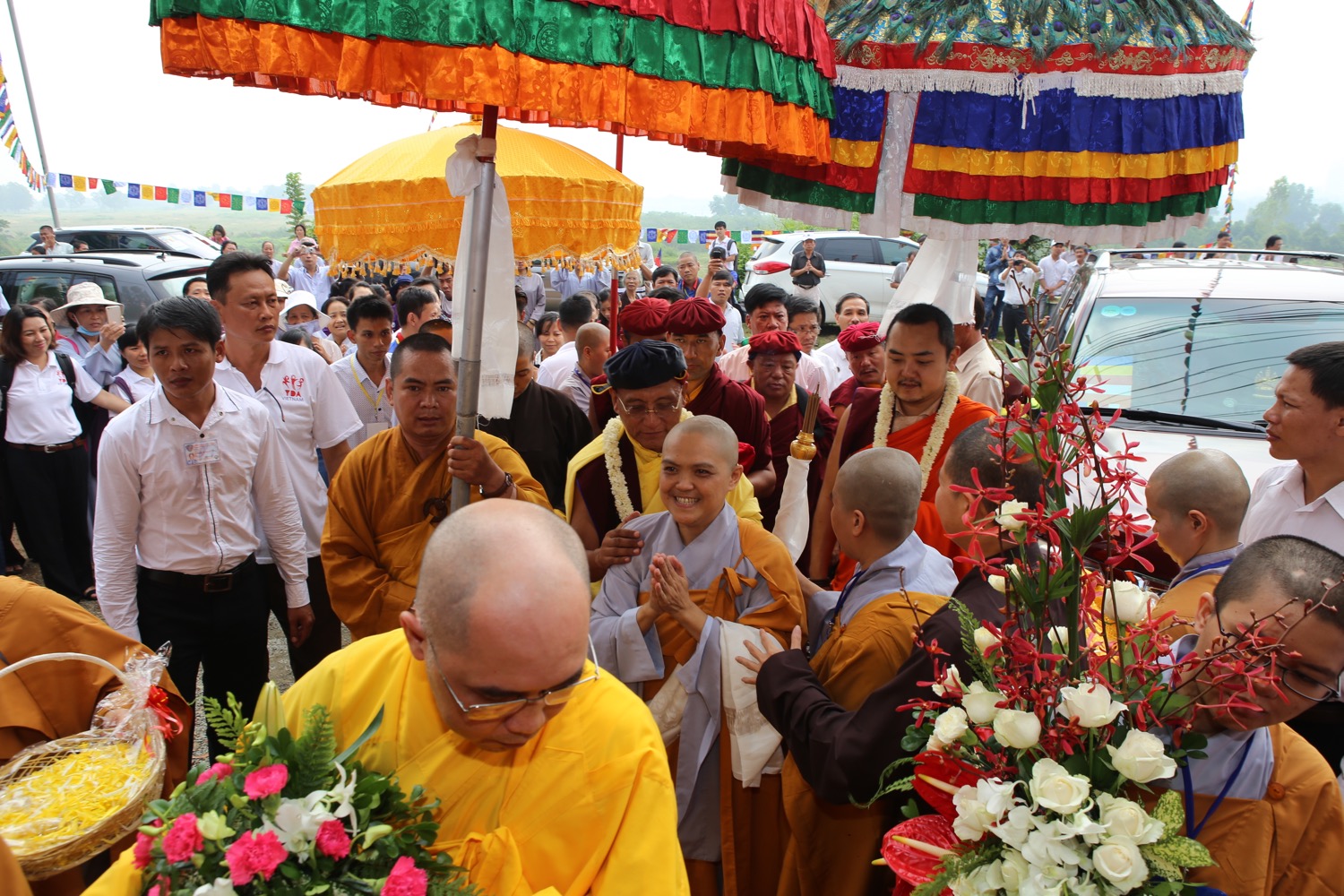Từ sáng sớm hôm nay, thứ Bảy ngày 10/10, hàng nghìn phật tử và người dân đã cùng vân tập tại Thiên Quang Ni Tự (Tỉnh Bình Dương) để tham dự Đại Pháp Hội Quán đỉnh cộng đồng, Cầu nguyện quốc thái dân an Mạn Đà La Bản Tôn A Di Đà Vô Lượng Thọ Phật - Đại Bi Lục Tự Quan Âm của Đức Pháp Vương Gyalwang Drukpa và Nhiếp Chính Vương Gyalwa Dokhampa. Đặc biệt, tại Pháp hội, các Ngài đã truyền giảng giáo pháp và tặng những phần quà đặc biệt cho những người khiếm thị đến từ Tỉnh Bình Dương và các vùng lân cận. Chúng tôi xin gửi tới Quý vị và các bạn những hình ảnh từ Đại lễ