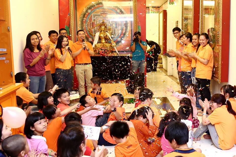 Inspired by the Buddha of Wisdom – Manjushri, who is known and close to most people, devoted group members and Buddhists of Vietnam Drukpa office in Hochiminh city (90C Vo Thi Sau, District 1, Hochiminh city) have chosen the Manjushri Wisdom as the theme for the first event and “designed” a fun-yet-educative and meaningful program for kids. Cheerful and vivid orange was the topic color of the event with the kids, their parents and volunteers all wearing orange. The place where the event was held was decorated with sculptures and pictures of Buddhas and the walls were also painted in orange, which looked impressive and unforgettable.