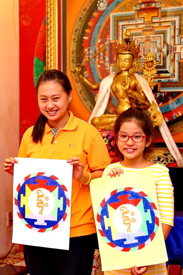 During the event’s program, kids were taught about the meaning of Manjushri Buddha: He sits on a moon disc and a lotus base with his right hand holding the sword of wisdom above his head (i.e. to eradicate all the evil and ignorance) or the book of knowledge in his left hand..., everything symbolizes wisdom and compassion.