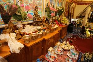 Phía dưới bức Thangka là ngọc Mani, tượng trưng cho sự giàu có của tâm Bồ đề (phần lý), hay là tượng trưng cho các phẩm vật cúng dường và sự viên mãn tâm nguyện của chúng sinh (phần sự). Tấm gương là biểu tượng của Đại viên cảnh trí, có thể soi rọi nghiệp chướng của chúng sinh một cách rõ ràng. Cây đàn là biểu tượng của diệu âm thanh, nêu biểu 60 diệu âm giác ngộ của Phật.