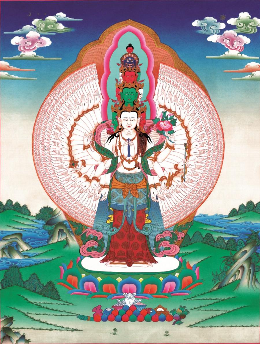 Đức Phật Quan Âm Thiên Thủ Thiên Nhãn đứng trên tòa sen trong tư thế chữ nhất, nêu biểu sự hợp nhất của lòng từ bi và trí tuệ.